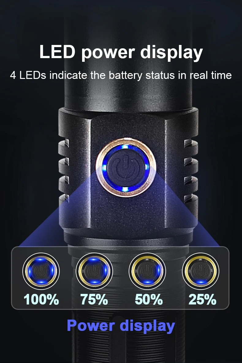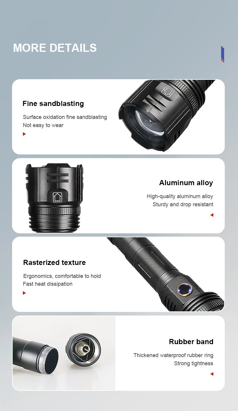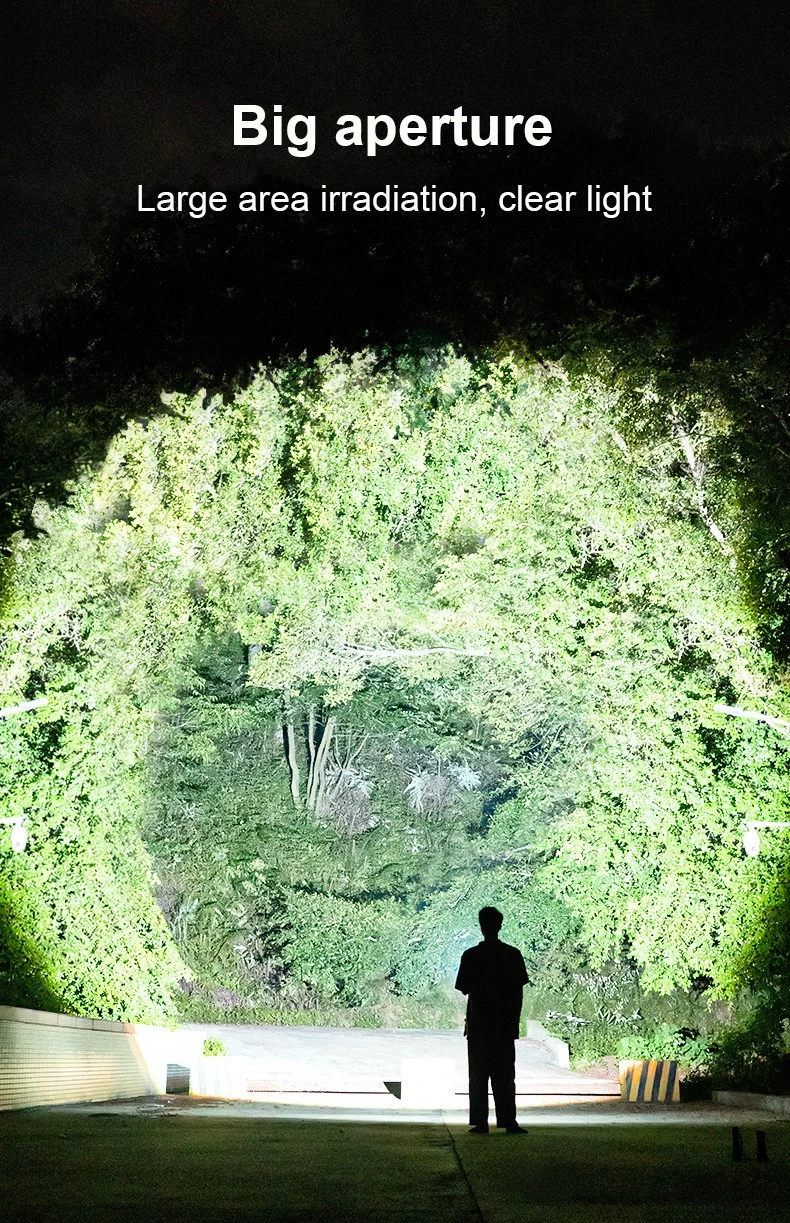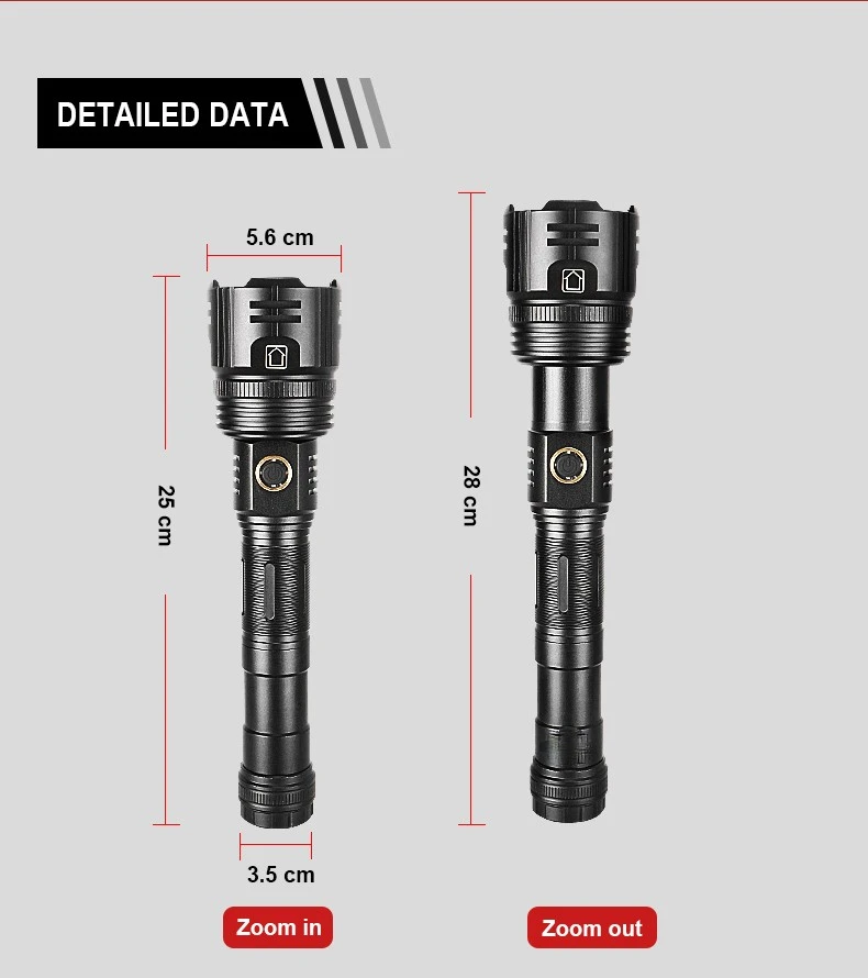 A1: The extension tube design of the flashlight can be switched between long and short styles. The number of batteries can be flexibly increased or decreased according to usage needs. Two 26650 high-capacity batteries can be used, with a battery life of up to 18 hours.