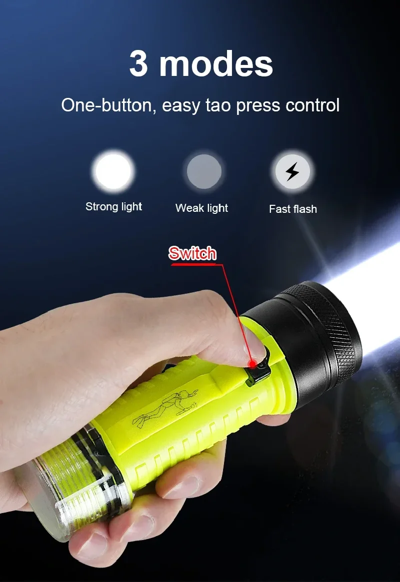 –The flashlight is equipped with a user-friendly push magnetic switch, allowing you to effortlessly turn the light on and off, even while submerged. Its ergonomically designed non-slip texture provides a secure grip, enhancing your control during use. Additionally, a waterproof rubber ring ensures that water ingress is never a concern, giving you peace of mind whether you are diving deep or exploring terrestrial landscapes.