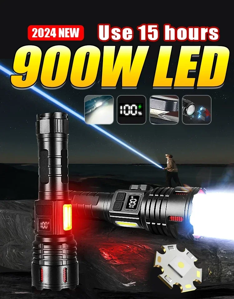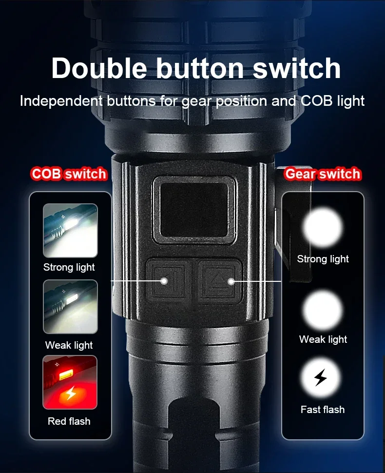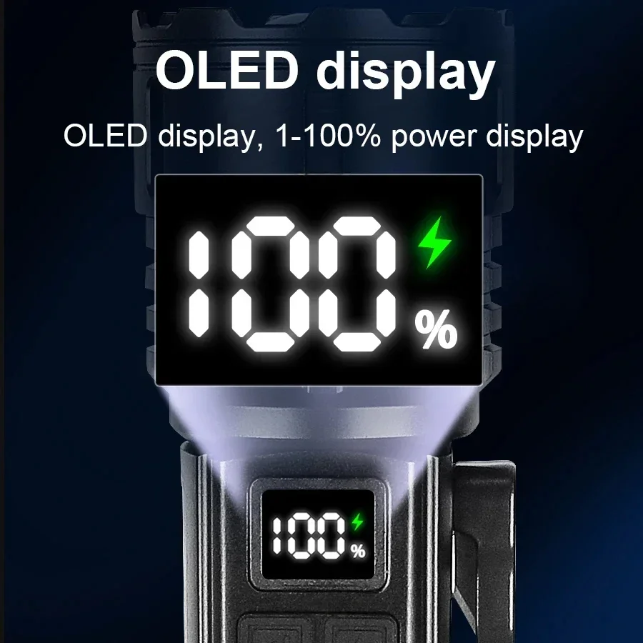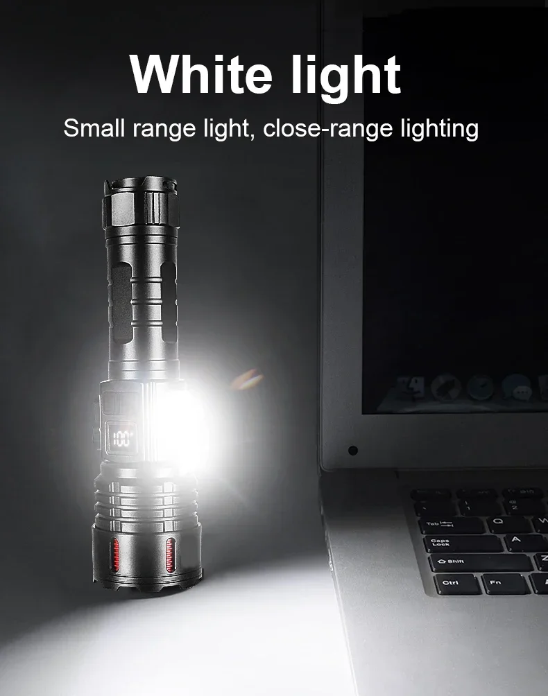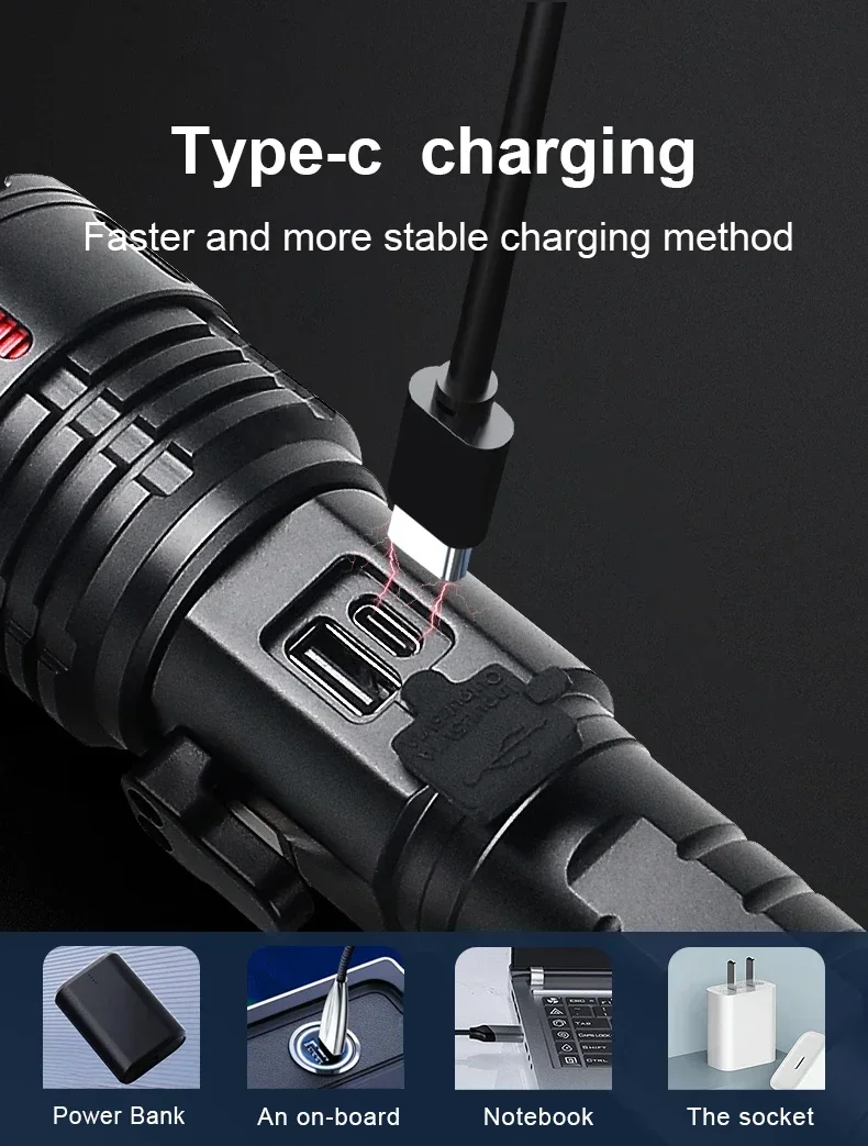 This flashlight is made of LED wick and COB light. It has a total of 6 levels of light, which is very convenient and practical. It has super brightness, long illumination distance, is very energy-saving, has high battery capacity and long battery life, making it a very cost-effective product. The flashlight is made of aluminum alloy, which is very hard, heat-resistant, corrosion-resistant and drop-proof. This product uses Type-C charging method and supports output, which is convenient and fast.