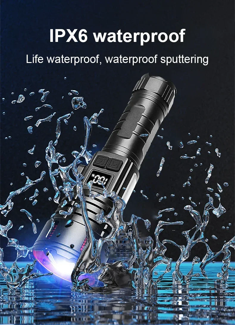 IPX6 waterproof–The waterproof level of the flashlight is IPX6. It can completely prevent small particles such as external dust from intruding into the flashlight. It is very indestructible and can be used normally in rainy days. It will not be corroded by rain and is very powerful.